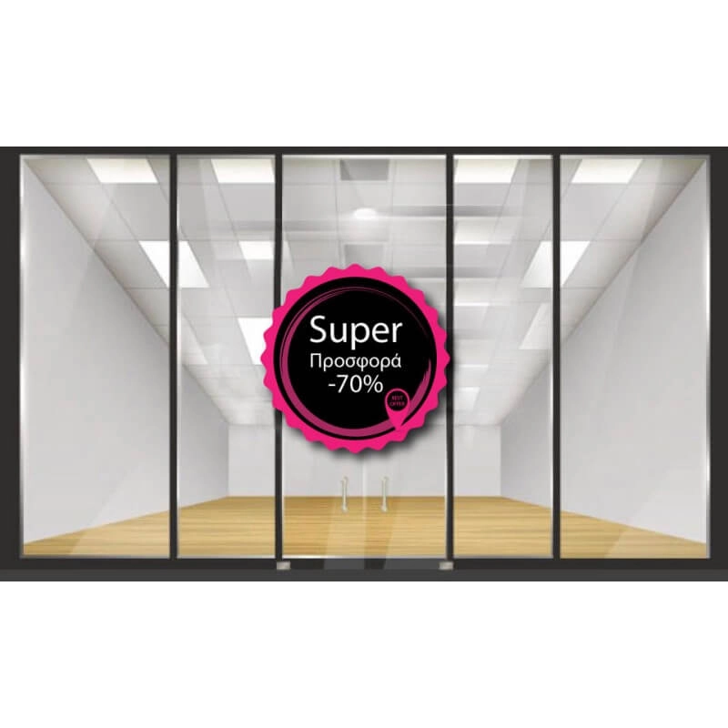 Πληροφορίες: Το εκπτωτικό αυτοκόλλητο βιτρίνας Super Προσφορά θα εντυπωσιάσει τη βιτρίνα που θα το τοποθετήσετε. Το αυτοκόλλητο είναι λεπτό και μαλακό, φαίνεται στη βιτρίνα σα ζωγραφιά κι όταν εσείς θέλετε, το ξεκολλάτε εύκολα χωρίς να αφήνει κατάλοιπα κόλλας.