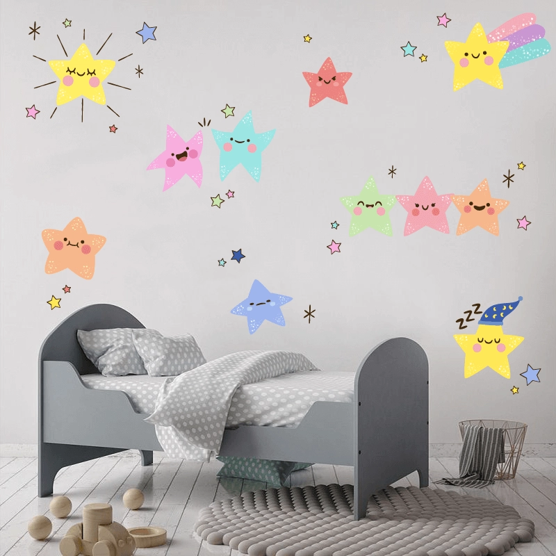 Προετοιμασια: Βεβαιωθείτε ότι η επιφάνεια στην οποία θα επικολλήσετε το αυτοκόλλητο για παιδικό δωμάτιο με πολύχρωμα αστεράκια, είναι αρκετά ομαλή.