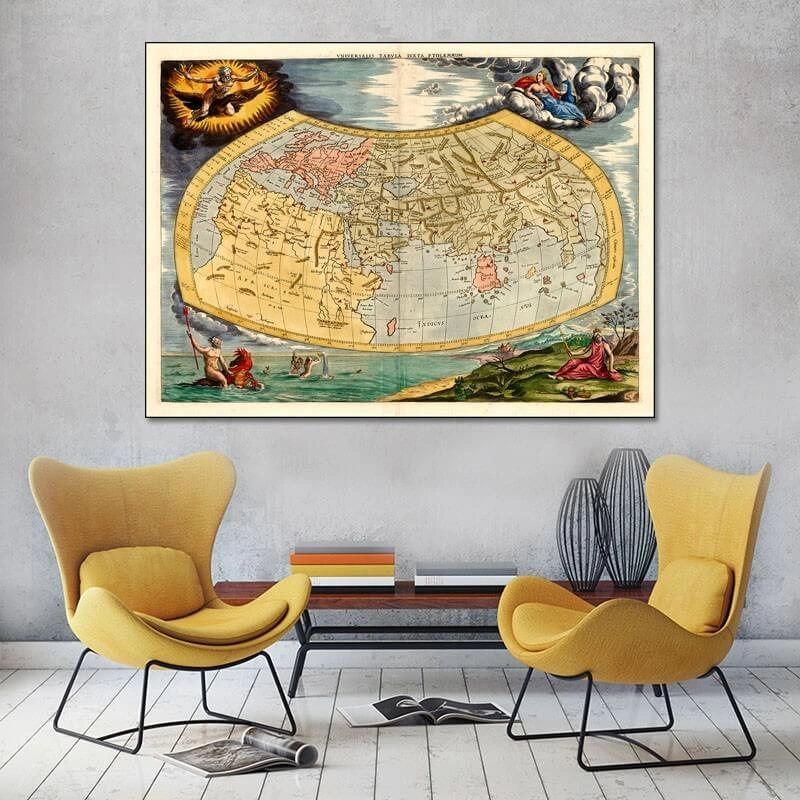 - Αποφύγετε να κρεμάσετε έναν μικρό Πίνακας σε καμβά Παγκόσμιος Χάρτης "...as known to the Ancients" σε έναν μεγάλο άδειο τοίχο. Προτιμήστε να τον τοποθετήσετε ανάμεσα σε δύο έπιπλα ή ακόμη και δύο παράθυρα.