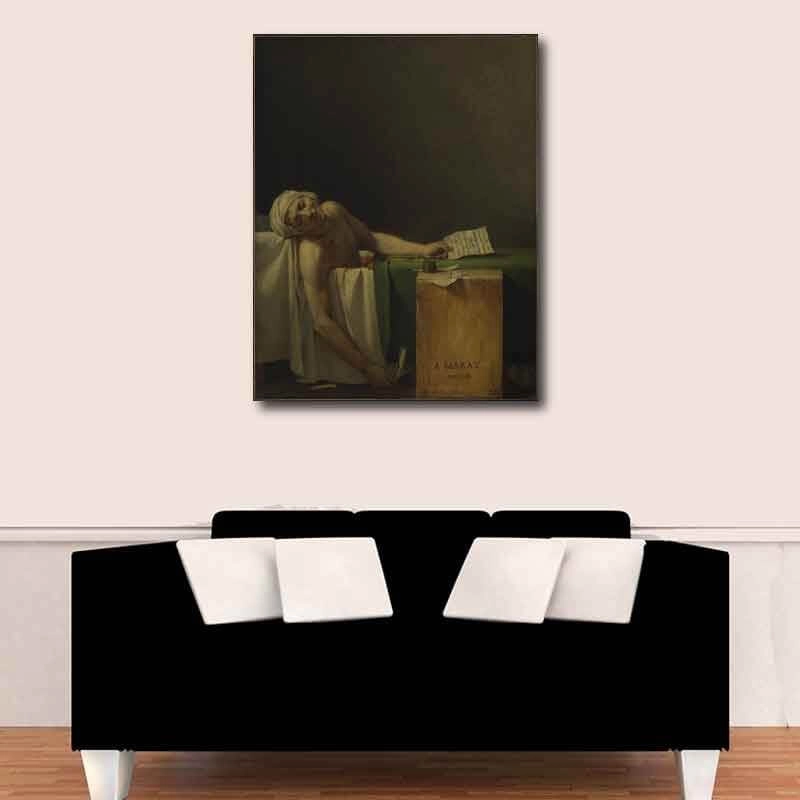 - Αποφύγετε να κρεμάσετε έναν μικρό Πίνακας σε καμβά Jacques Louis David - The Death of Marat - 1793, σε έναν μεγάλο άδειο τοίχο. Προτιμήστε να τον τοποθετήσετε ανάμεσα σε δύο έπιπλα ή ακόμη και δύο παράθυρα.