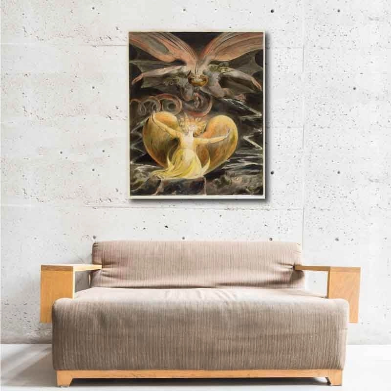 - Αποφύγετε να κρεμάσετε έναν μικρό Πίνακας σε καμβά William Blake - The Great Red Dragon and the Woman Clothed with Sun - 1805, σε έναν μεγάλο άδειο τοίχο. Προτιμήστε να τον τοποθετήσετε ανάμεσα σε δύο έπιπλα ή ακόμη και δύο παράθυρα.
