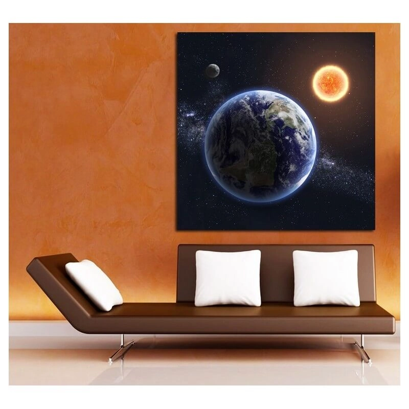 - Αν ένας πίνακας σε καμβάς με ήλιο και γη, τοποθετηθεί επάνω από ένα έπιπλο όπως έναν καναπέ, μπουφέ, κάποιο γραφείο κ.α., θα πρέπει να είναι κεντραρισμένος με το συγκεκριμένο έπιπλο. Σε περίπτωση που σε αυτό το έπιπλο υπάρχουν διακοσμητικά αντικείμενα, δε θα πρέπει να βρίσκονται σε θέσεις που να κρύβουν μέρος του καμβά με ήλιο και γη. Πολύ σημαντικό είναι να διατηρείται η οπτική ισορροπία.