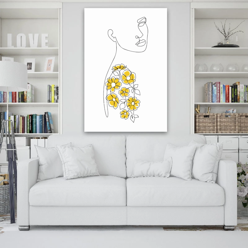 Πίνακας σε καμβά Line Art Girl with Golden Flowers